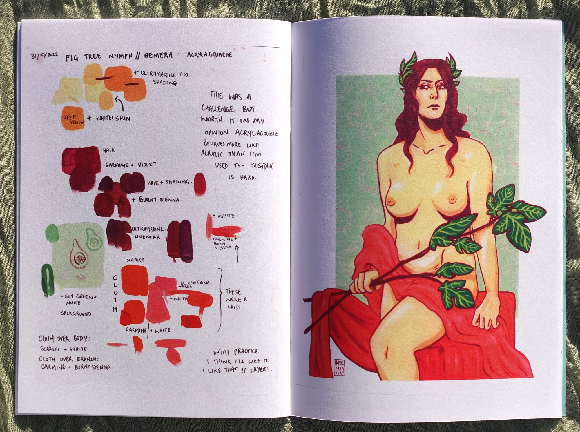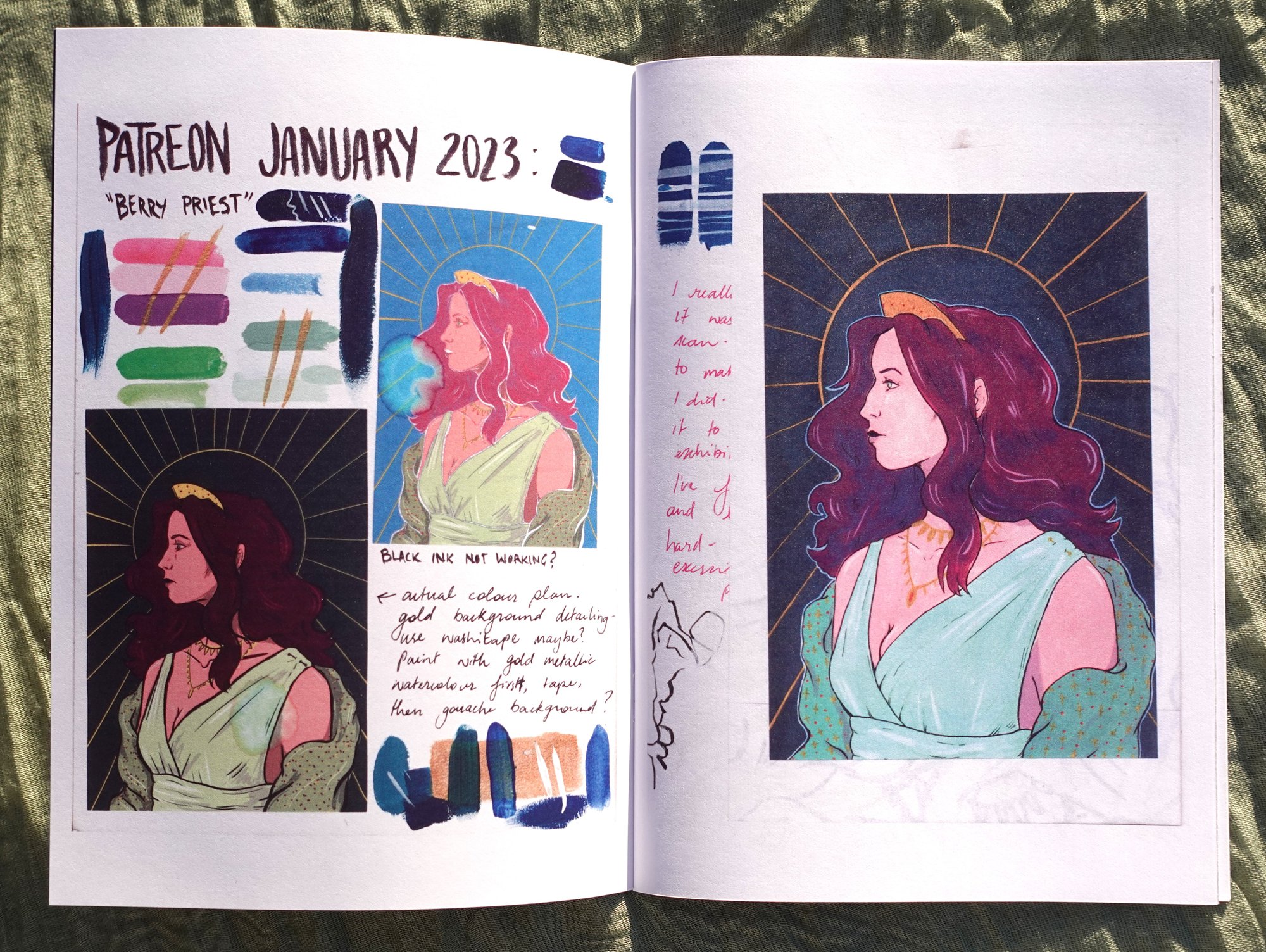 Inside, you'll find the final version of each monthly painting, as well as scans from my sketchbook that show the process of creating each painting - from initial sketches and ideas, to swatches, to my final thoughts on how each project went.