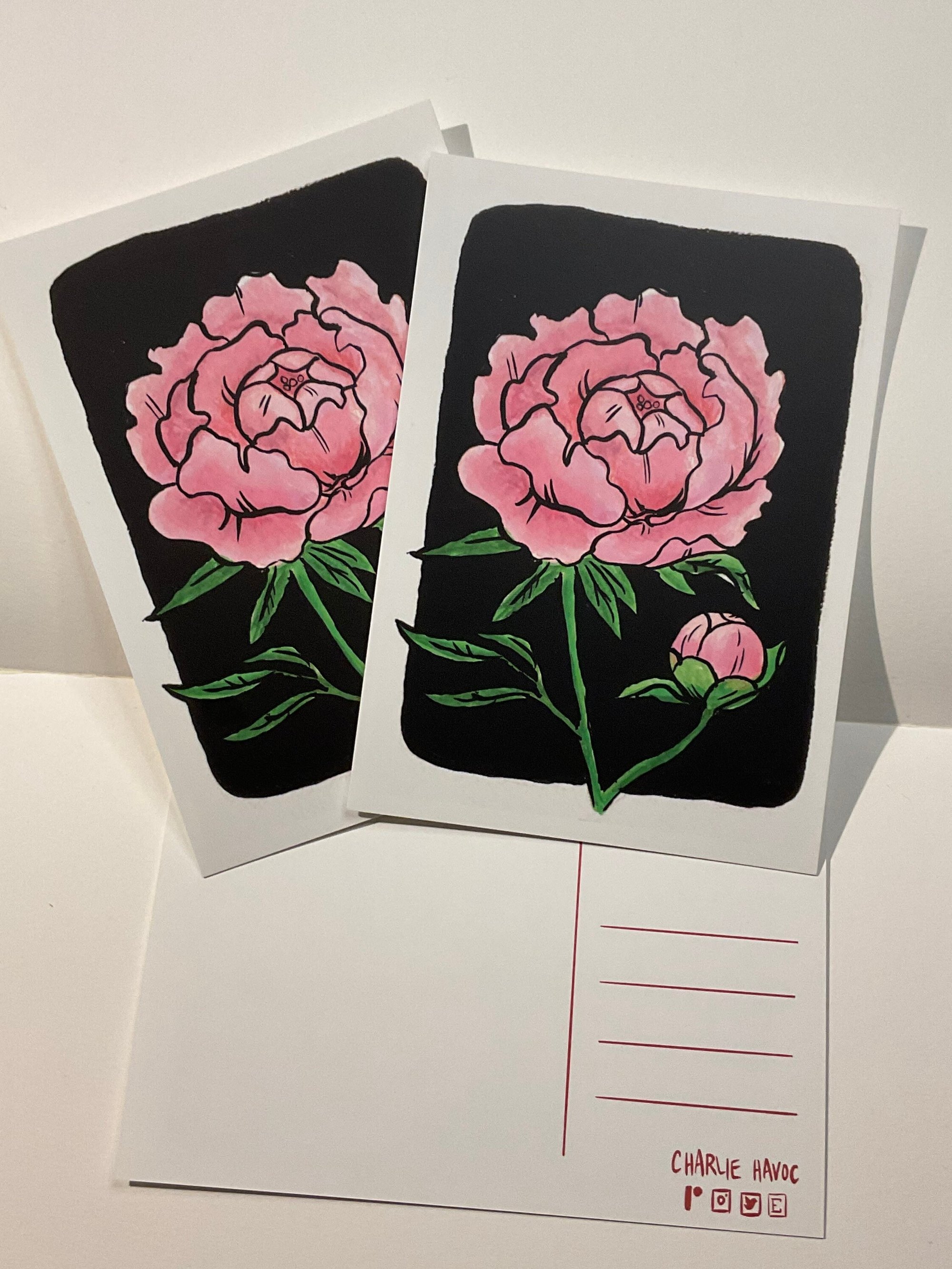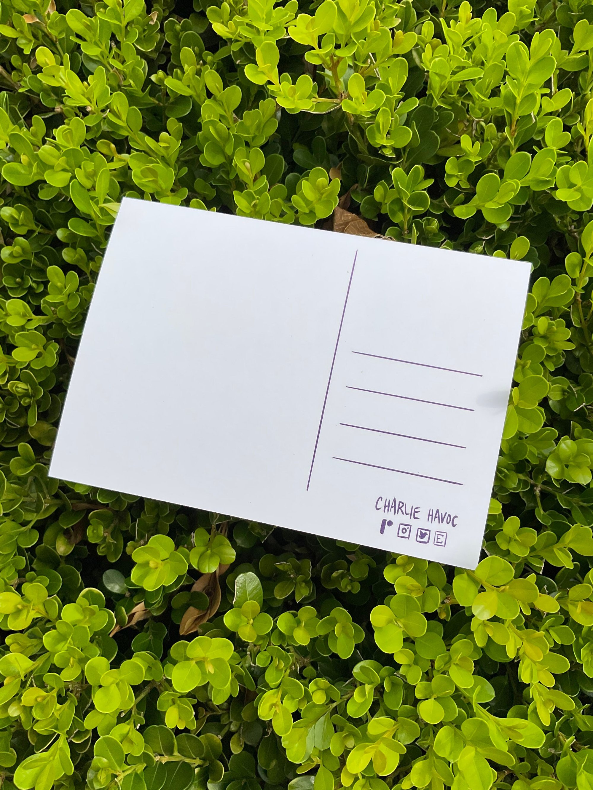 Postcards are printed on heavyweight stock to survive the brutal mailing system. The print side has a slight shine to, and the back is uncoated for ease of writing.